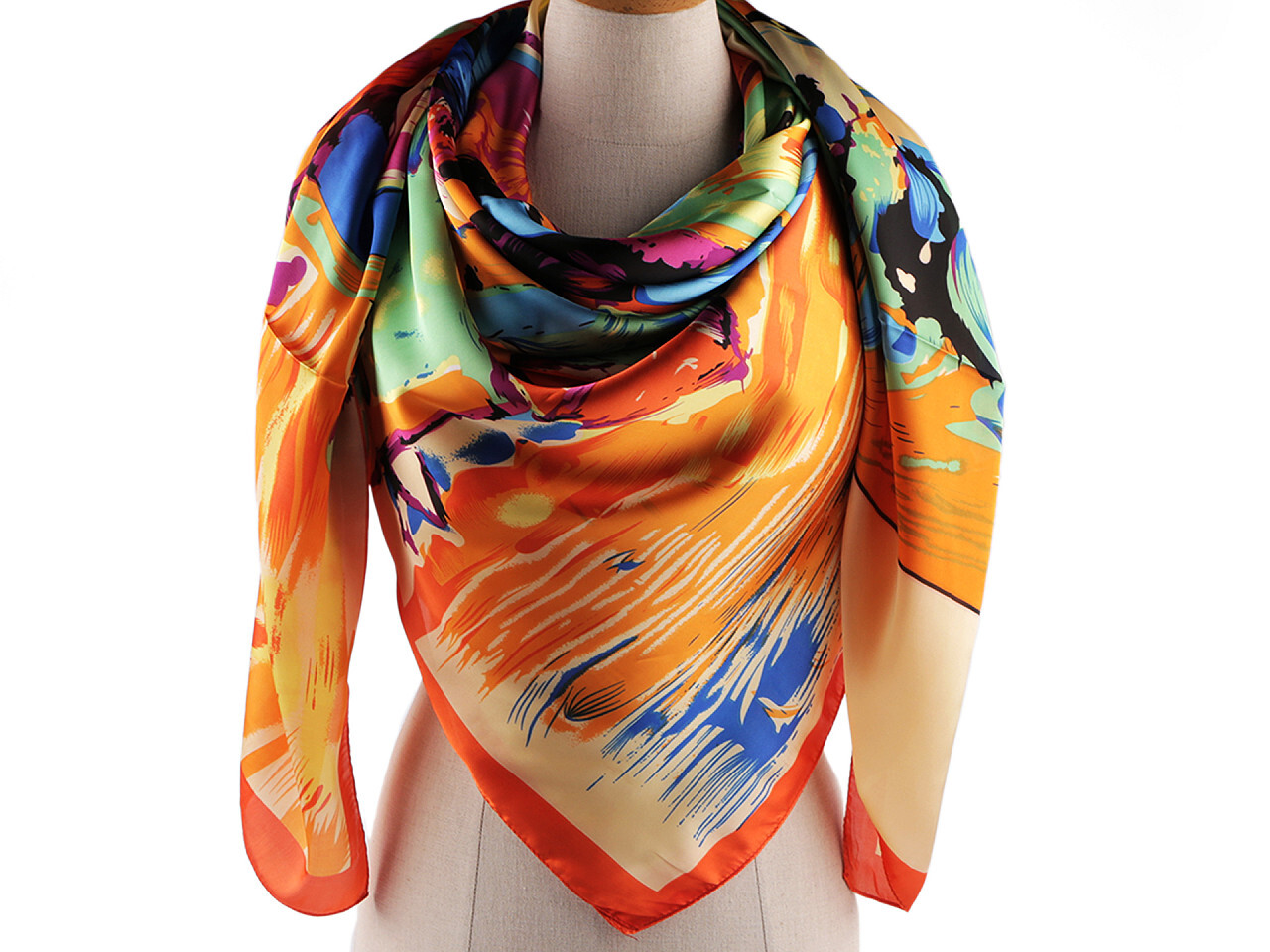 Velký saténový šátek s květy 130x135 cm - 1 ks - 24 oranžová