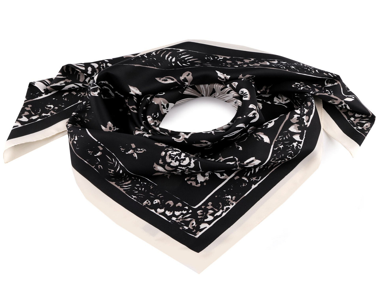 Velký saténový šátek s motivem větviček a květů využijete na každodenní nošení. Je lehounký a měkký, doslova vás bude hýčkat, protože na dotek připomíná hedvábí. Šátek můžete uvázat do slušivého uzlu, který podtrhne eleganci vašeho oděvu. Šátek je jednostranný.