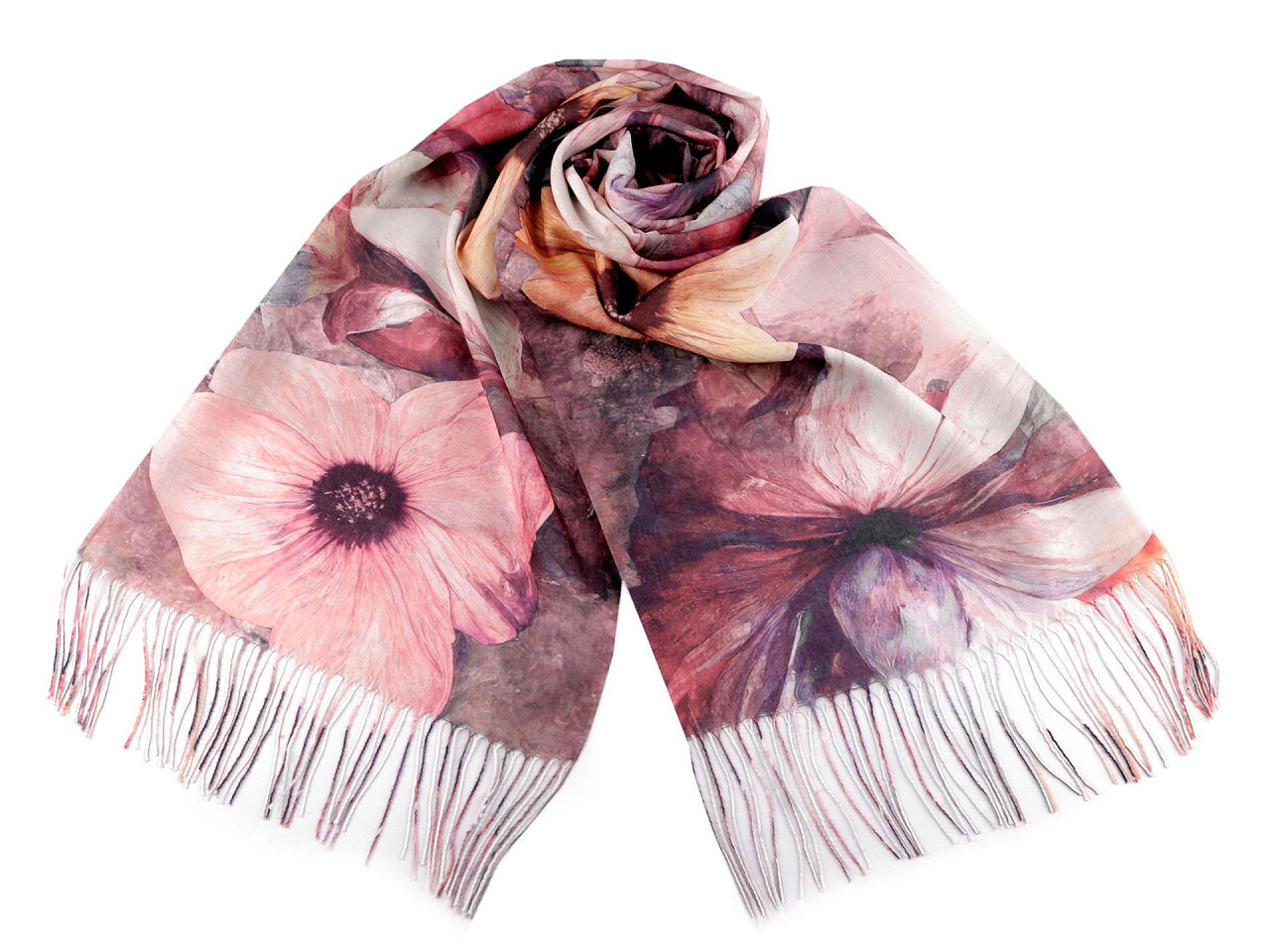 Letní šátek / šála s třásněmi květy 70x180 cm - 1 ks - 6 starorůžová