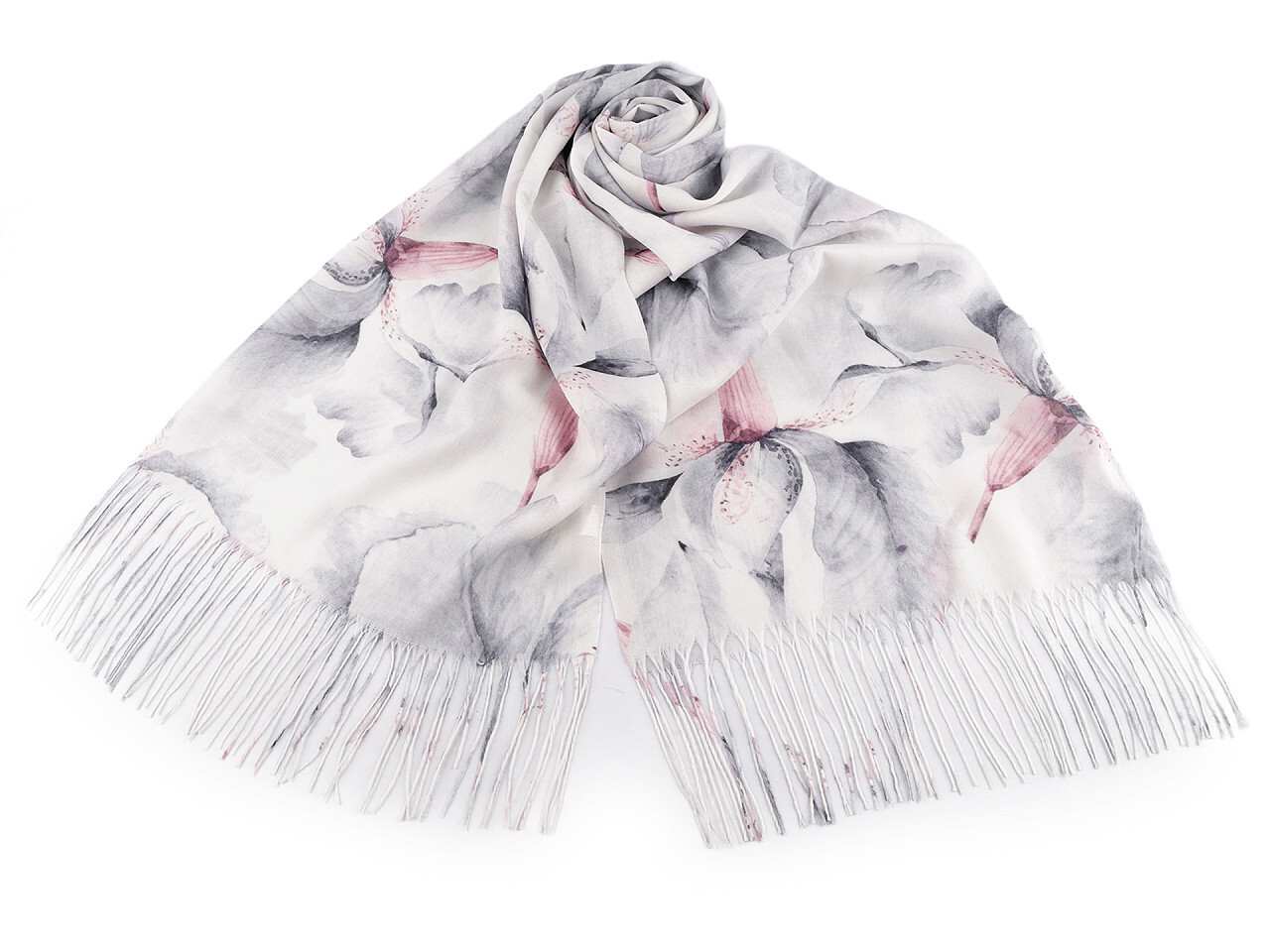 Letní šátek / šála s třásněmi velké květy 70x180 cm - 1 ks - 1 šedá nejsvětlější