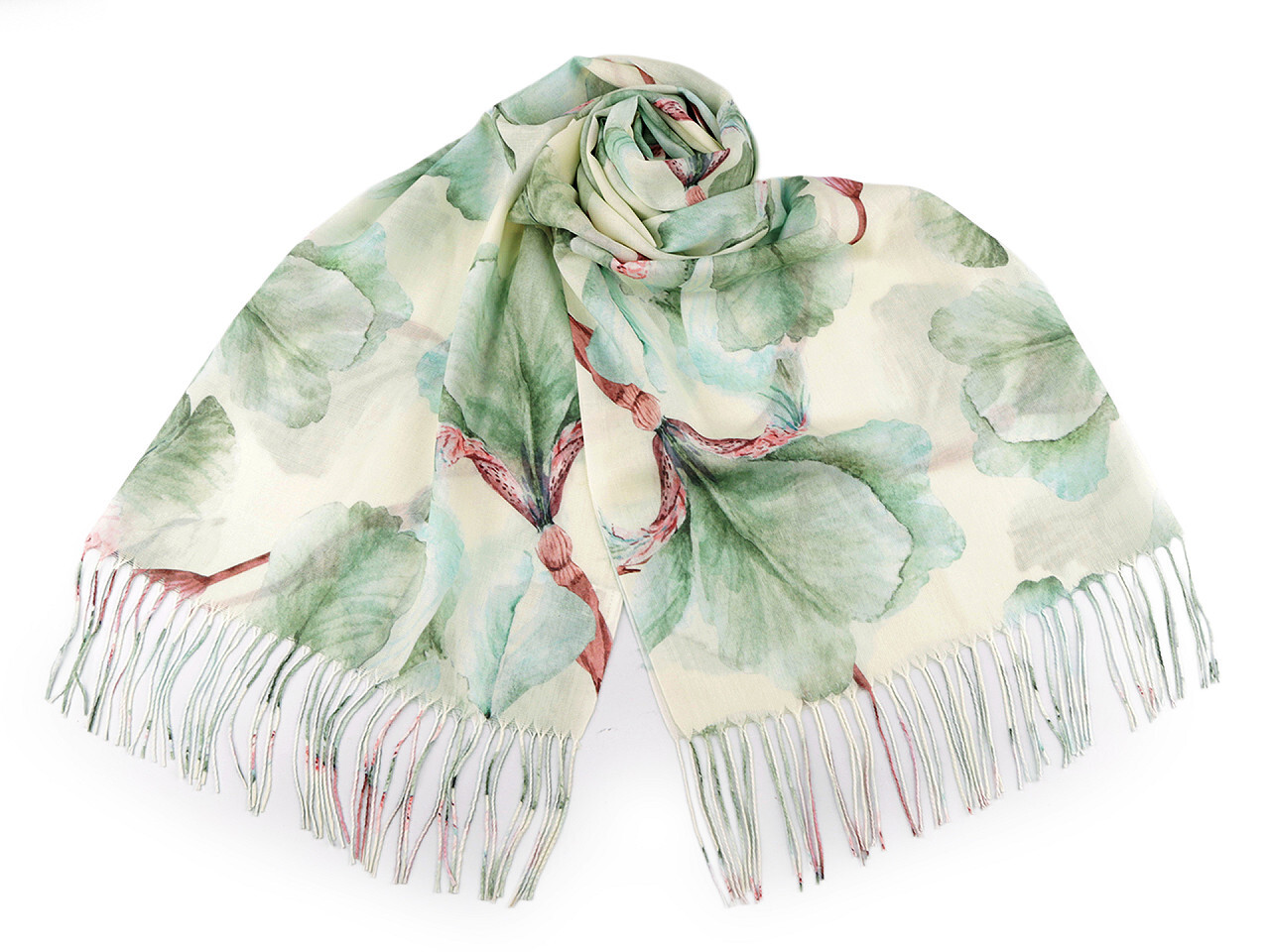 Letní šátek / šála s třásněmi velké květy 70x180 cm - 1 ks - 6 zelená past.sv.
