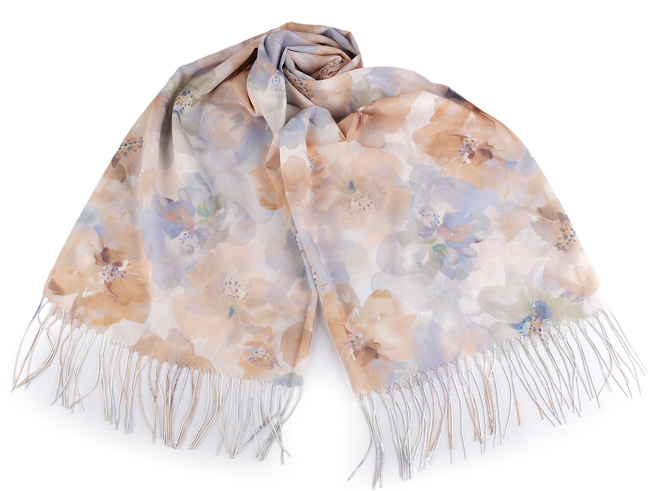 Letní šátek / šála s třásněmi květy 70x180 cm - 1 ks - 2 béžová světlá modrá světlá