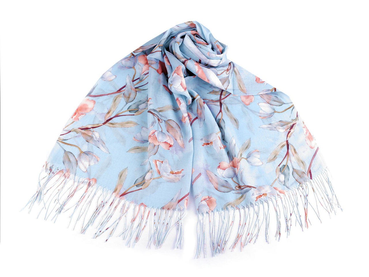 Letní šátek / šála s třásněmi květy 70x180 cm - 1 ks - 6 modrá světlá