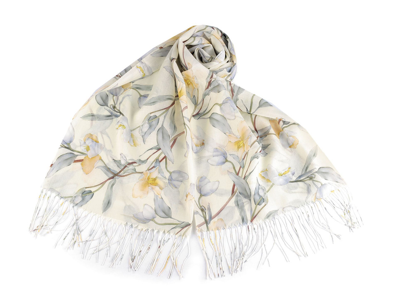 Šátek s motivem rozkvetlých květů je vzdušný a lehký, velice příjemný na dotek. Bude elegantním doplňkem pro každou příležitost. Je jemně průsvitný, na koncích má třásně. Doladí váš outfit, ať už si vezmete sako, halenku, svetřík či šaty.