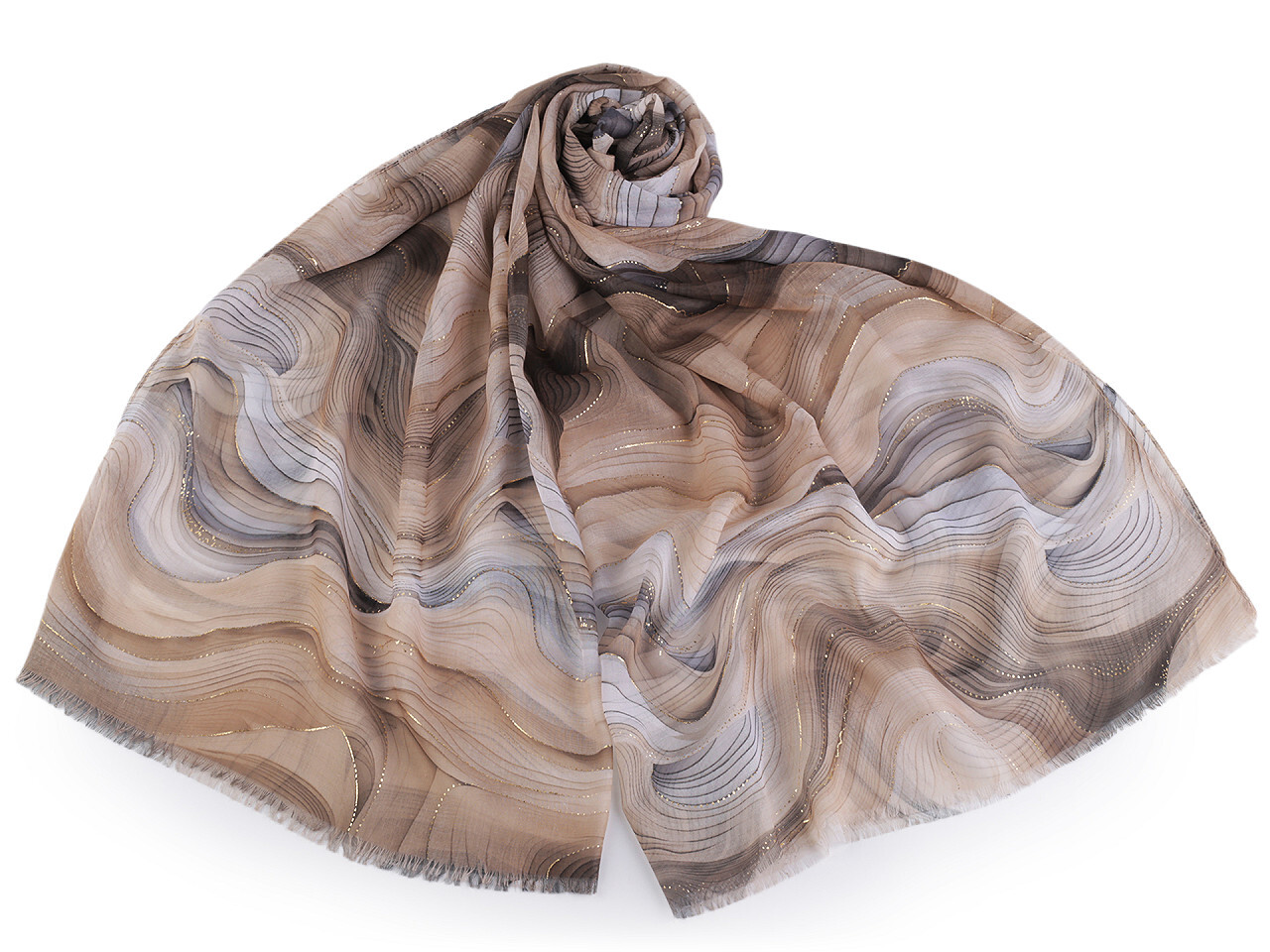 Šátek se zlatými detaily je vzdušný a lehký, velice příjemný na dotek. Bude elegantním doplňkem pro každou příležitost. Lehce prosvítá. Doladí váš outfit, ať už si vezmete sako, halenku, svetřík či šaty.