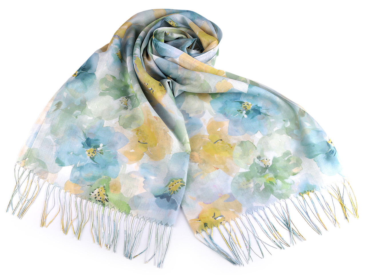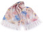 Šátek s motivem velkých květů, které vypadají jako akvarelová malba, je vzdušný a lehký, velice příjemný na dotek. Bude elegantním doplňkem pro každou příležitost. Je jemně průsvitný, na koncích má třásně. Doladí váš outfit, ať už si vezmete sako, halenku, svetřík či šaty.
