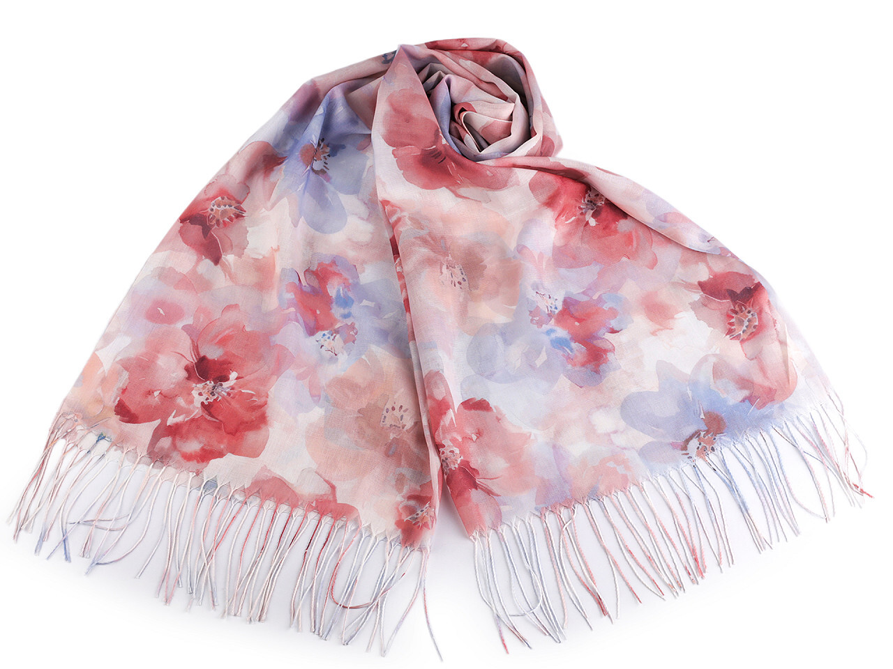 Letní šátek / šála s třásněmi květy 70x180 cm - 1 ks - 5 korálová světlá modrá světlá