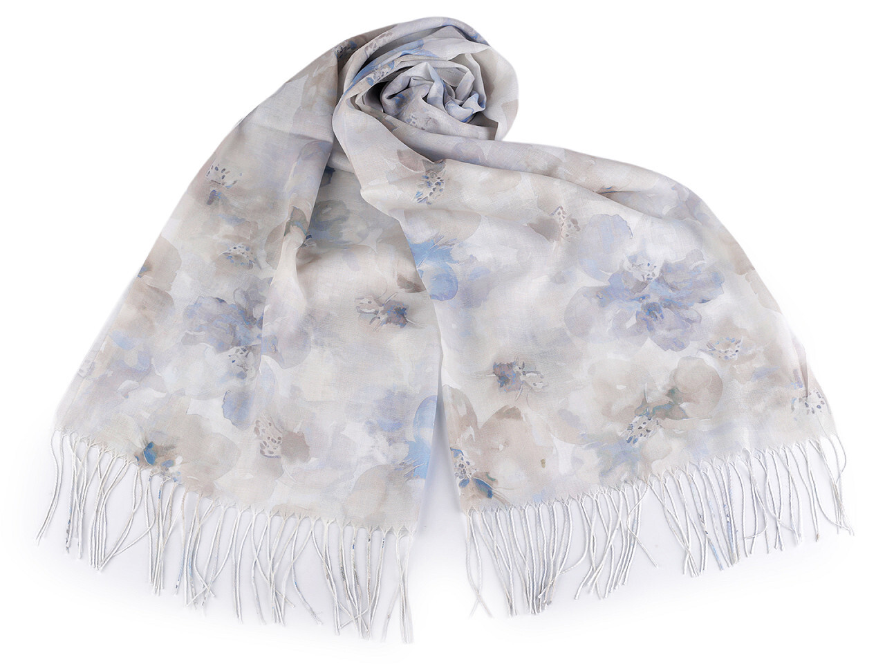 Letní šátek / šála s třásněmi květy 70x180 cm - 1 ks - 1 béžovobílá modrá světlá