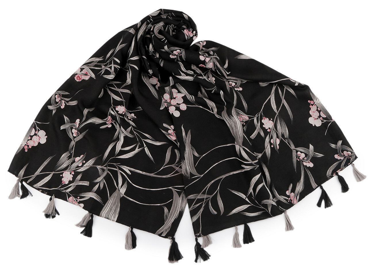 Šátek / šála / pléd s květy a střapci 80x180 cm - 1 ks - 6 černá
