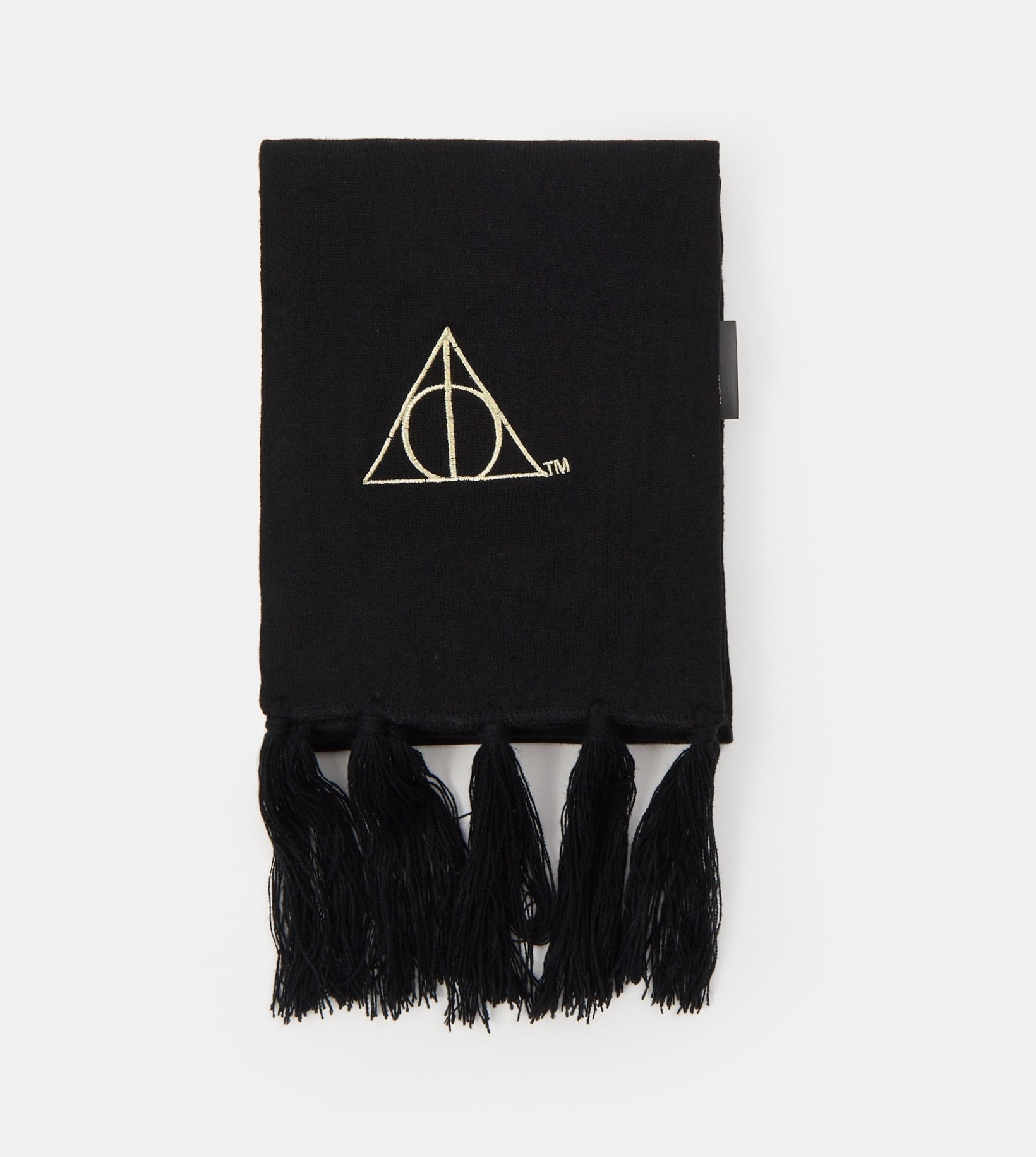 Černá šála s nápisem Hogwarts (Bradavice) a symbolem Relikvií smrti. Oficiální licencovaný produkt.