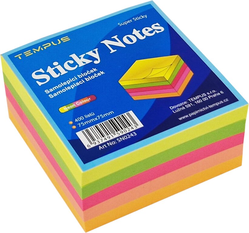 samolepící papírový bloček - 5 neonových barev, papírky mohou být opakovaně použity, nezanechávají stopy po použití a samovolně se neodlepují.