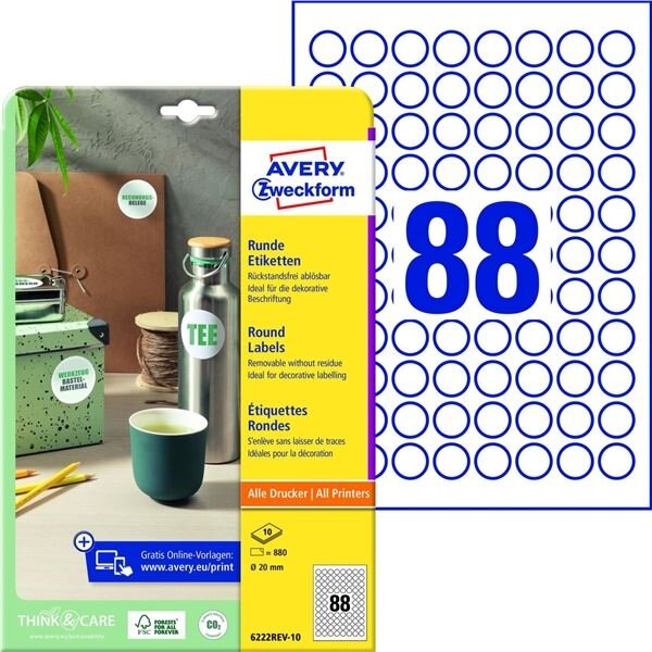 Snímat. kulaté etikety Avery, bílé, 20 mm, 880 ks