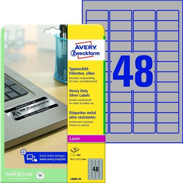 Velmi odolné polyesterové etikety Ideální pro trvalé označení majetku, výrobků varovné nápisy či instrukce Odolné vůči prachu, natržení, vodě, UV záření a vlivům počasí a teplotním změnám -40 °C do +150 °C Vhodné pouze pro černobílé laserové tiskárny Na etikety lze psát propiskou či lihovým fixem - text je poté trvalý. Při použití fixu na bílé tabule lze text poté z etikety odstranit Online šablony a software zdarma ke stažení na www.avery-zweckform.cz