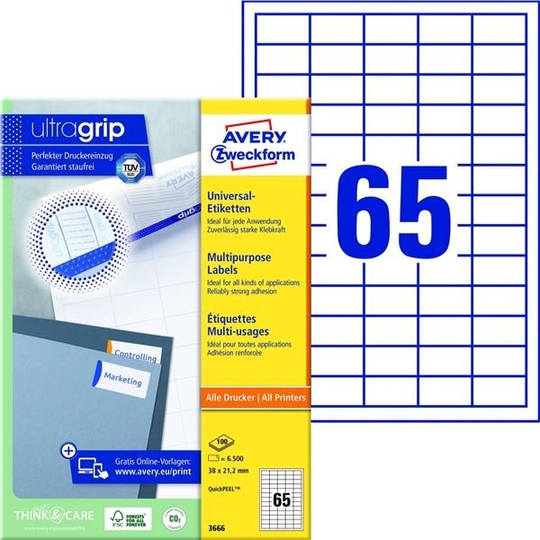 Inovativní technologie ultragrip na zadní straně archu zajišťuje bezchybné natažení archu etiket a tisk bez zasekávání archu etiket v tiskárně Univerzální bílé etikety jsou určeny pro každodenní použití na listovní zásilky a balíky, na označování, číslování, oceňování sortimentu či výrobků Formáty A6, A5, A4 lze použít k nejrůznějším plošným aplikacím Etikety mají speciální lemování, které zabraňuje zanášení tiskárny lepidlem Na etikety se jednoduše tiskne a mají dlouhodobou přilnavost Etikety jsou ekologicky šetrné a mohou být plně recyklovatelné jako součást běžného papírového odpadu Etikety jsou vyráběny z papíru získaného z odpovědných a obnovitelných zdrojů Vhodné pro inkoustové, laserové tiskárny a kopírovací stroje Díky technologii QuickPEEL™ jsou etikety snadno snímatelné z archu Online šablony a software zdarma ke stažení na www.avery-zweckform.cz