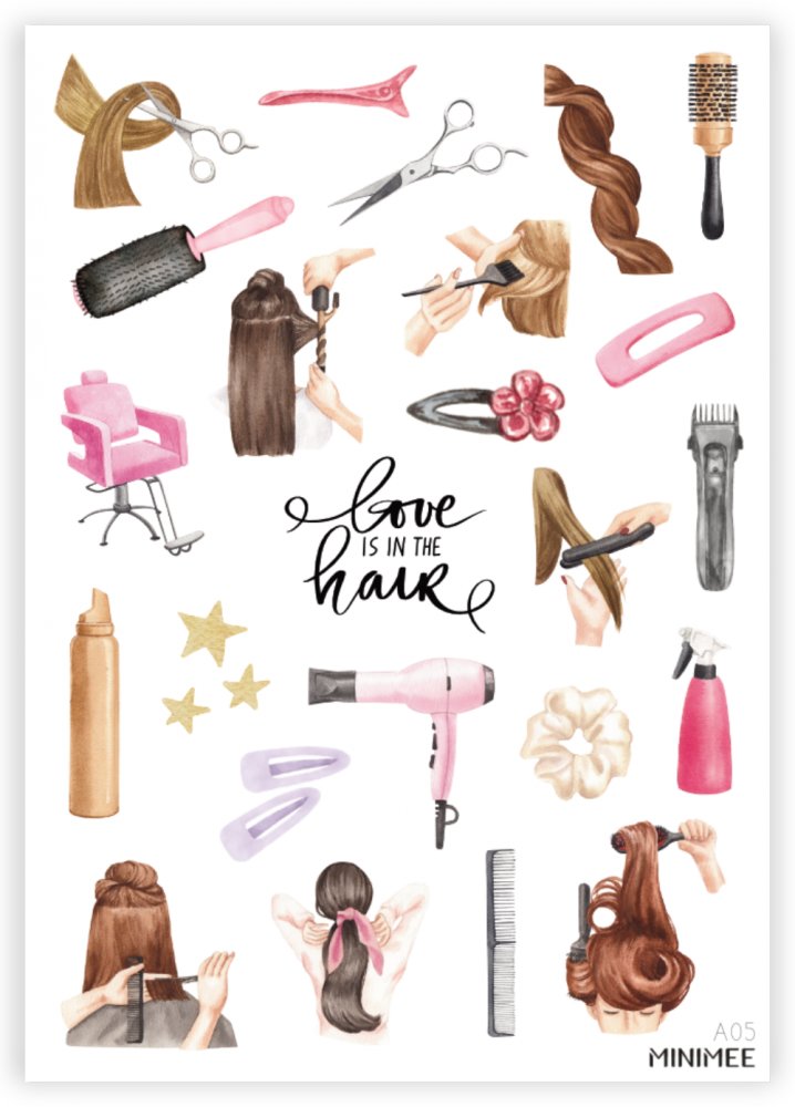 Vyřezávané watercolor samolepky v aršíku A5 s vlasovou tematikou. Krásné vlasy jsou vizitkou ženy a je třeba o ně pečovat. Tyto samolepky Vám plánování návštěvy salónu parádně zpříjemní!Vyrobeno v Česku.