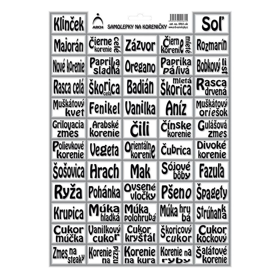 Nálepky na pepřenky Vám s tím pomohou. Na ,,archu" se nachází 57 nálepek s potiskem různých koření. Např. hladká mouka, polohrubá, majoránka, atp.