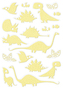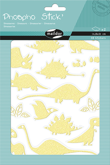 Sada fosforeskujících samolepek obsahuje 2 archy s celkem 38 fosforeskujícími obrázky dinosaurů (formát archů A5).