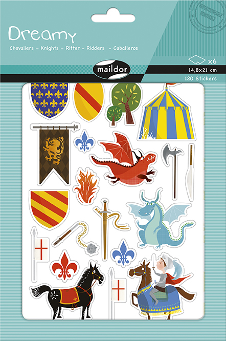Sada samolepek s motivem Rytířů obsahuje 6 archů s celkem 120 samolepkami. Samolepky lze použít na vyrábění koláží, k dotvoření kreseb, při tvoření přáníček nebo narozeninových pozvánek, nebo si s nimi děti mohou ozdobit své sešity.