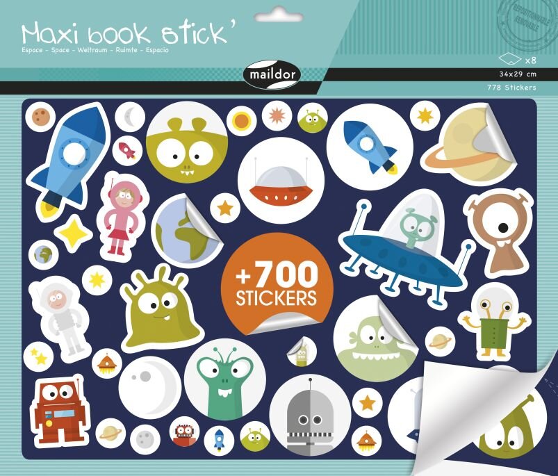 Sada samolepek s motivy vesmíru, raket a ufo obsahuje 8 archů s více než 700 samolepkami různých velikostí.