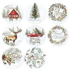 Naklejki papierowe na taśmie O25mm 8 wzorów Boże Narodzenie choinka, wianki, górska chata, pick-up z choinkami, renifer 500szt.