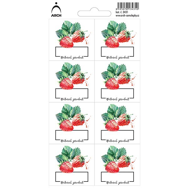 Jahody "Natural product" představují sadu 8 voděodolných laminovaných etiket, které snadno ochrání popisky i za vlhkých podmínek. Tyto samolepky jsou ideální pro označení domácích výrobků, díky čemuž máte vždy přehled o obsahu a původu svých pokladů.