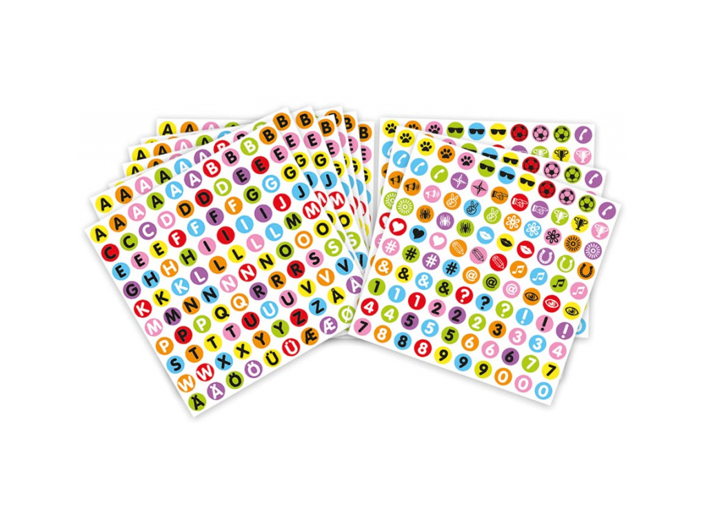 Barevné samolepky písmen, symbolů a číslic (10 archů - 1000ks), průměr cca 15 mm. Vhodné k nalepení na bílé korálky kód 2471494.