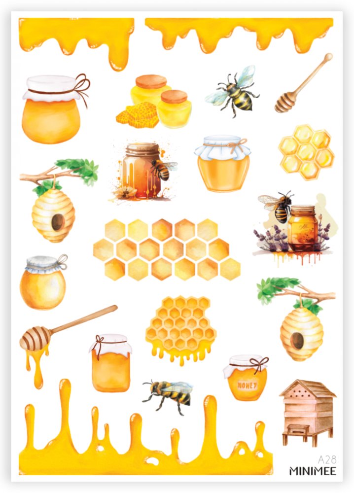Vyřezávané samolepky s medovými dobrotami, plástvemi a včelkami. Samolepky v aršíku A5 se perfektně hodí k tečkovaným zápisníkům MINIMEE pro bullet journal či scrapbooking. Kvalitní bílá samolepka matného přírodního vzhledu dobře přilne a drží na většině materiálů.Vyrobeno v Česku.