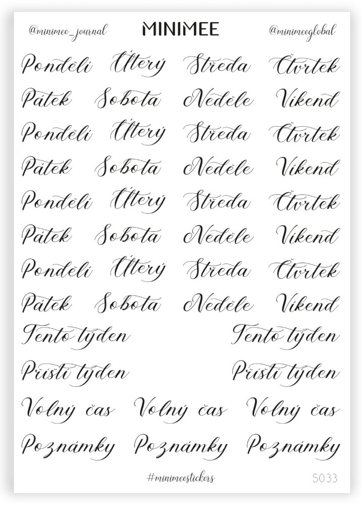 Krásné vyřezávané samolepky v aršíku A5, které zaujmou nejen svým designem. Perfektně se hodí k papíru zápisníku MINIMEE. Kvalitní bílá samolepka matného, přírodního vzhledu.Aršík obsahuje české dny v týdnu napsané krasopisem.Vyrobeno v Česku.