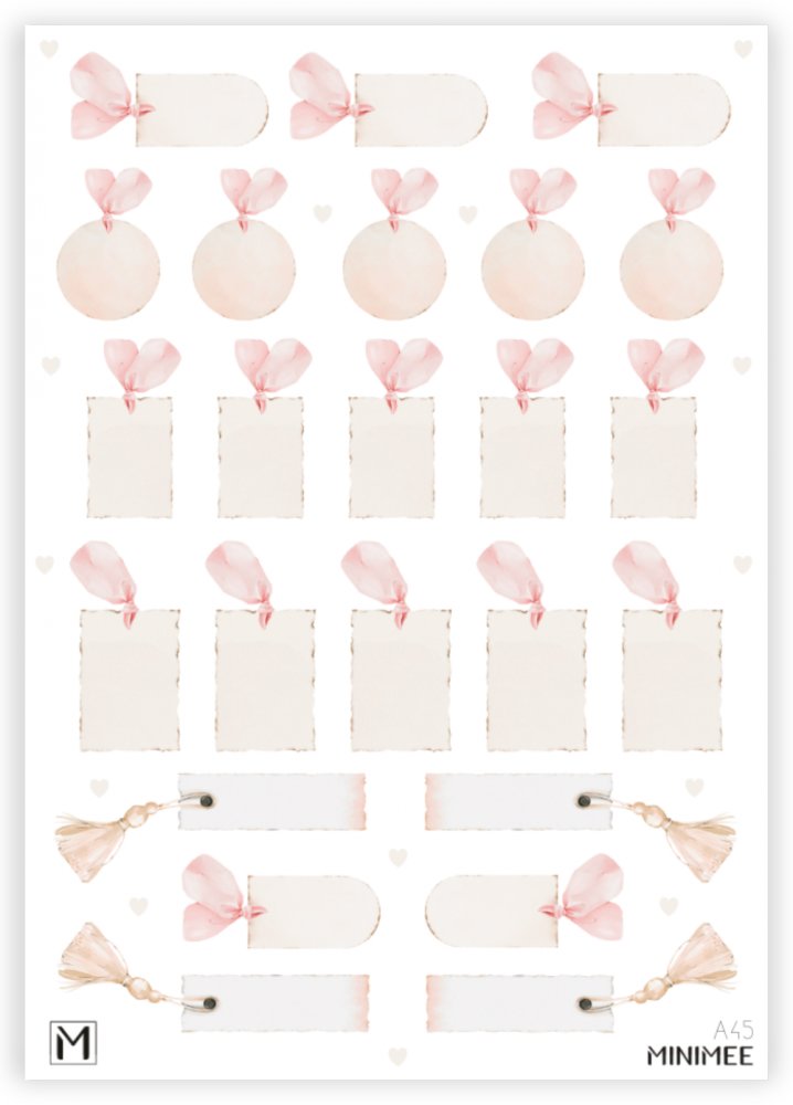 Krásné vyřezávané watercolor samolepky v aršíku A5. Aršík zahrnuje různé štítky krémové barvy s růžovou ozdobou.Do štítků lze psát třeba číslice, datum, jméno, den, atd.Vyrobeno v Česku.