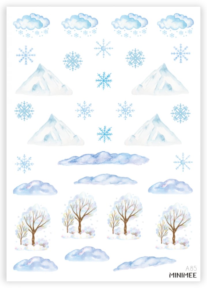 Samolepky se zimními motivy v aršíku A5. Vločky, hory, sníh. S těmito samolepkami vykouzlíte krásné zimní přehledy. Perfektně se hodí k papíru zápisníku MINIMEE. Kvalitní bílá samolepka matného, přírodního vzhledu. Vyrobeno v Česku.