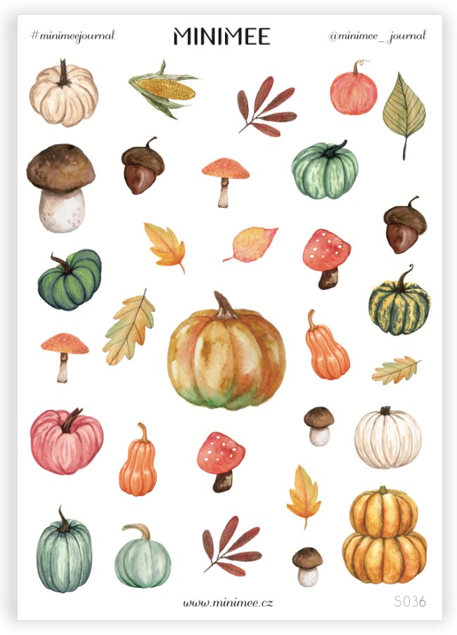Krásné vyřezávané samolepky v aršíku A5, které zaujmou nejen svým designem. Perfektně se hodí k papíru zápisníku MINIMEE. Kvalitní bílá samolepka matného, přírodního vzhledu.Aršík obsahuje sadu samolepek pro podzimní tvoření. Dýně, hříbky, listy a jiné. Vyrobeno v Česku.