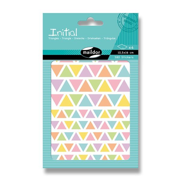 Samolepky Maildor Inital s různými barvami a velikostmi trojúhelníků. Balení obsahuje 4 listy, 2 motivy po 2 ks. Samolepky lze sloupnout a znovu nalepit.Rozměry balení: 10,5 x 16 cm.