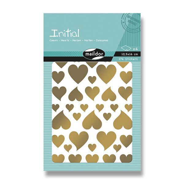 Samolepky Maildor Inital s různými velikostmi srdcí ve zlaté a stříbrné barvě. Balení obsahuje 4 listy, 2 motivy po 2 ks. Samolepky lze sloupnout a znovu nalepit.Rozměry balení: 10,5 x 16 cm.