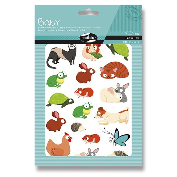 Samolepky Maildor Baby velké velikosti pro snadnou manipulaci s dětskými motivy domácích zvířátek. Balení obsahuje 6 listů, 2 motivy po 3 ks. Samolepky lze sloupnout a znovu nalepit,Vhodné pro děti již od 2 let.Rozměry balení: 14,8 x 21 cm.