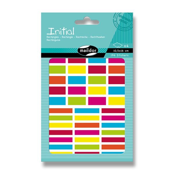 Samolepky Maildor Inital s různými barvami a velikostmi obdélníků. Balení obsahuje 4 listy, 2 motivy po 2 ks. Samolepky lze sloupnout a znovu nalepit.Rozměry balení: 10,5 x 16 cm.