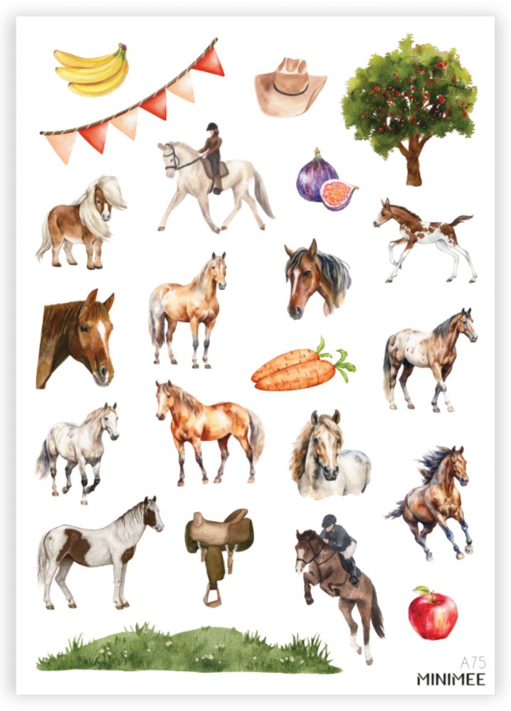 Krásné vyřezávané samolepky v aršíku A5 pro milovníky koní. Kvalitní papírové samolepky matného vzhledu.Vyrobeno v Česku.