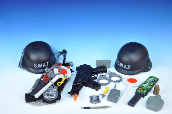 Policejní sada - helma 22cm+samopal 34cm +doplňky v síťce