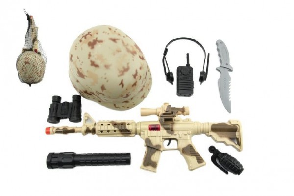 Vojenská sada samopal 47cm na setrvačník jiskřící+helma/přilba+doplňky v síťce