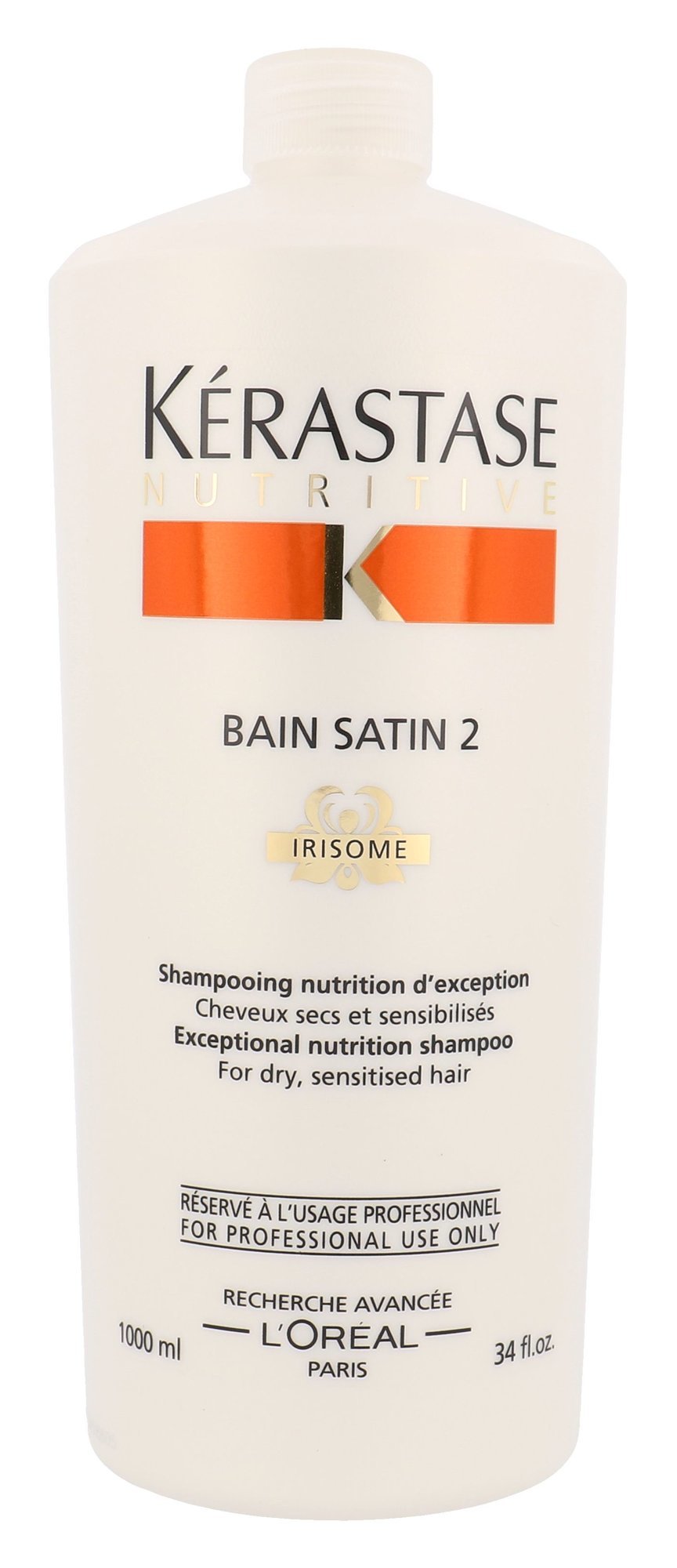 Šampon s kompletní výživou pro suché vlasy **Kerastase Nutritive Bain Satin 2 Irisome**. Pro dlouhotrvající výživu a hydrataci vlasů, která působí jak na příčinu ztráty výživy vlasů - oxidaci, tak i na její důsledky - vysušování. Vyživuje a hydratuje vlasy, vyhlazuje vlasová vlákna. Obnovuje vlasy od kořínků po konečky. Zjemňuje vlasy a navrací jim lesk. **Použití**: Aplikujte na mokré vlasy a jemně masírujte. Při oplachování nanášejte postupně malé množství teplé vody a jemně emulgujte. Důkladně opláchněte. Aplikaci zopakujte dle potřeby.