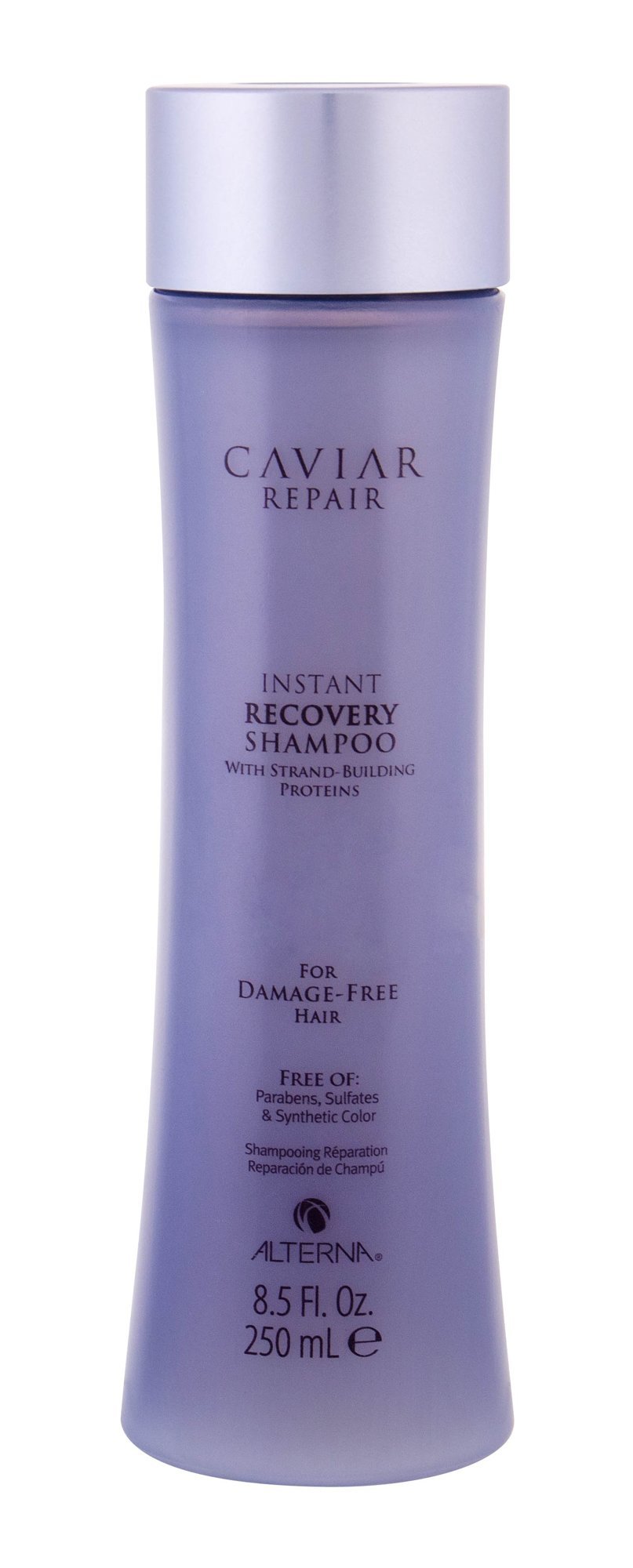 Šampon **Alterna Caviar Repairx Instant Recovery Shampoo**. Šampon Alterna Caviar Repairx Instant Recovery Shampoo s bohatým složením regeneruje a obnovuje poškozené vlasy. Okamžitě dodává vlasům jemnost a hebkost. Vlasům i pokožce hlavy poskytuje potřebnou hydrataci a péči. Po použití budou vlasy zdravější, silné a lesklé. **Použití**: Aplikujte na mokré vlasy. Jemně vmasírujte a poté důkladně opláchněte.