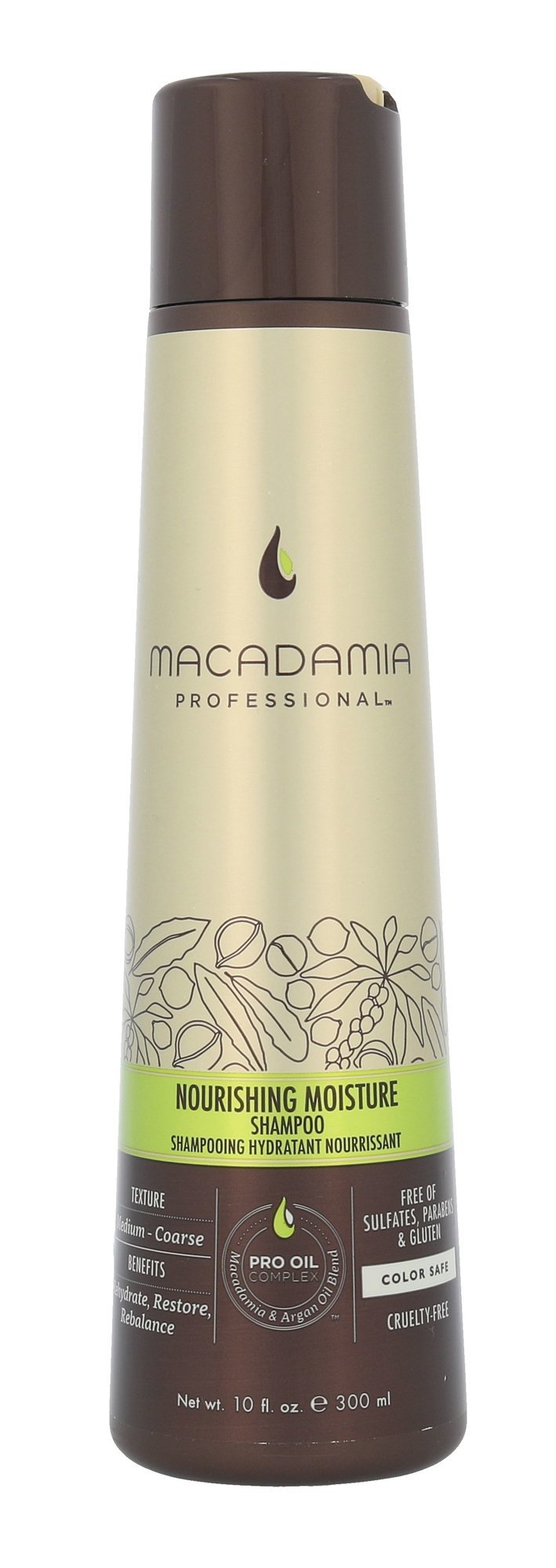 Šampon **Macadamia Nourishing Moisture**. Šampon Macadamia Nourishing Moisture pro hloubkovou výživu a hydrataci normálních a hrubých vlasů. Bohaté složení pomáhá opravovat poškozená místa. Zároveň vlasy posiluje a chrání. Zanechává vlasy jemné, vyživené a zdravé. Dopřejte svým vlasům hloubkovou péči s přípravkem Macadamia Nourishing Moisture. **Obsahuje**: · makadamiový olej - vyživuje vlasy · arganový olej - posiluje vlasy · olej z vlašských ořechů - intenzivně vlasy hydratuje · avokádový olej - vyživuje a hydratuje vlasy · kolagen, vitamín A, C a E - posiluje vlasy **Použití**: Aplikujte na mokré vlasy. Jemně masírujte a poté důkladně opláchněte.