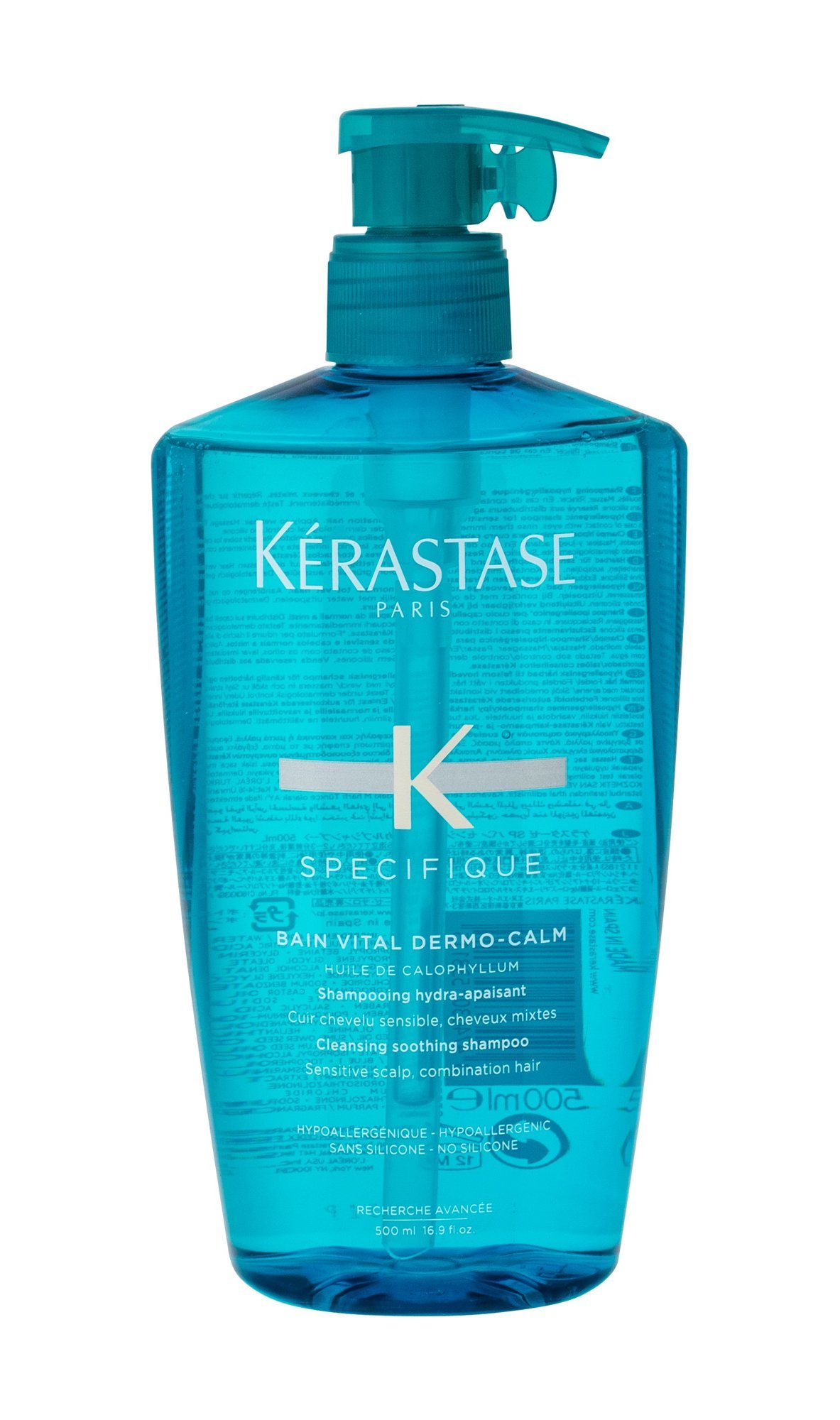 Šampon **Kérastase Specifique Bain Vital Dermo-Calm**. Šampon Kérastase Specifique Bain Vital Dermo-Calm je speciálně určen pro citlivou pokožku hlavy. Uklidňuje, hydratuje a ozdravuje vlasovou pokožku. Vyživující složky dodávají hebkost a pružnost vlasům. **Použití**: Nanést na mokré vlasy a jemně masírovat. Na závěr důkladně opláchnout.