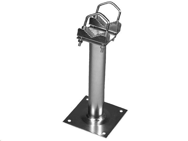 Montážní základna má čtyři otvory pro šrouby o průměru 10 mm, takže ji lze bezpečně ukotvit ke zdi nebo jiné konstrukci pomocí běžného kotvicího materiálu. Třmen se snadno přizpůsobí různým průměrům stožáru, takže není třeba řešit výměnu nebo úpravy.