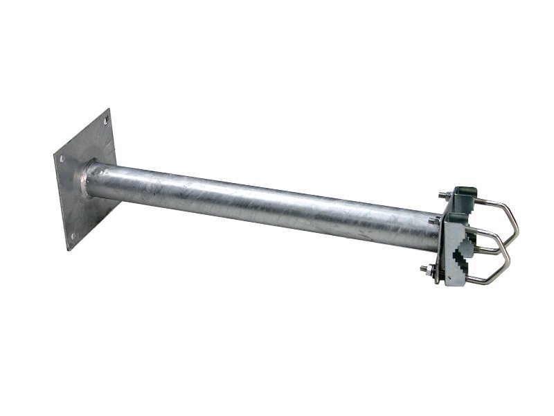 Držák na stěnu se třmenem pro upevnění stožáru o průměru 35 - 60 mm s odsazením 50 cm. Rozměr základny 15 x 15 cm.