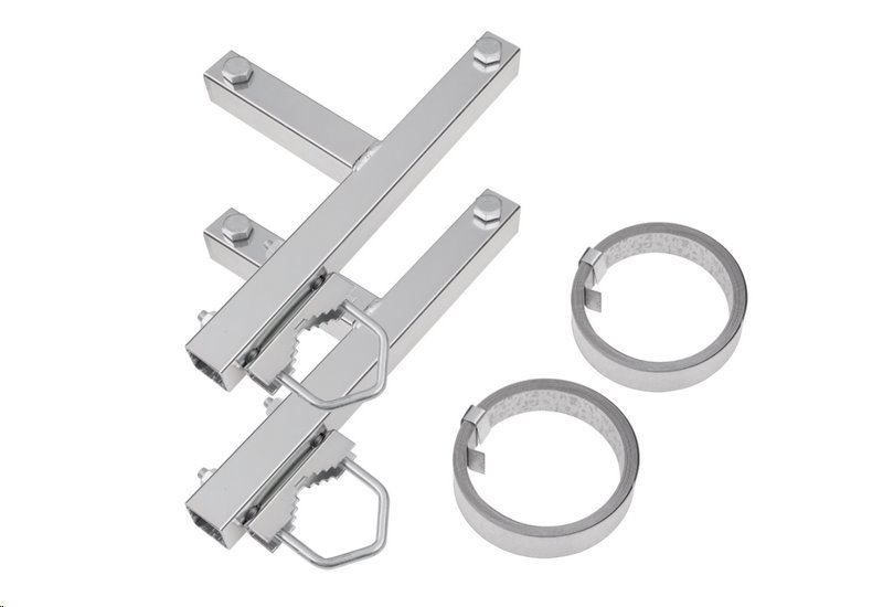 Konzole komínová s aretačními šrouby. Je určena pro upevnění stožáru ke komínu, bez nutnosti vrtání. Upevnění zajistí pozinkované ocelové pásky o šířce 25 mm. Pro stožár do průměru 50 mm. Maximální výška stožáru 3 m.