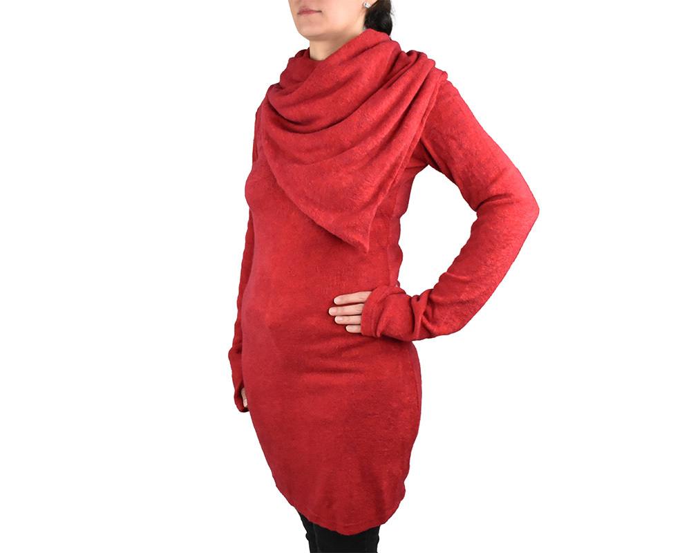 Jedinečný kousek, který spojuje pohodlí s módním designem. Úpletové šaty s velkým límcem se zapínáním a nařasením do protisměru na dva knoflíky - menší klopu zapínáme knoflíkem do poutka na levém rameni, delší na pravé rameno, abychom dosáhli nařaseného efektu. Materiál je pružný a hřejivý. Rukávy jsou zakončeny otvorem pro palec.