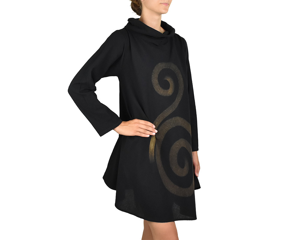 Jedinečný kousek, který propojuje pohodlí a moderní design. Šaty ve volném „A“ střihu zaručují maximální komfort i volnost pohybu. Díky dlouhým rukávům a výraznému límci jsou ideální do chladnějších dnů. Variabilní střih dává možnost nosit je buď jako vzdušné šaty nebo jako originální tuniku...
