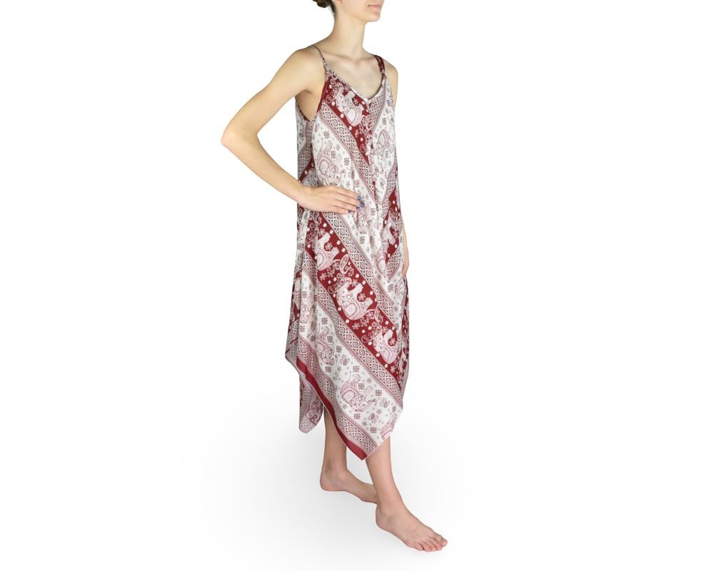Středně dlouhé volné šaty s tenkými posuvnými ramínky. Ideální do horkého letního počasí. Spodní část šatů je střižena do delších cípů.Materiál: 100% viskóza Rozměry: Kratší délka: 55 cm Delší délka: 106 cmŠířka přes prsa: 51 cm Velikost max. L