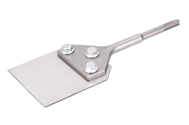 speciální sekáč se špachtlovým ostřím v šířce 100 mm s úchytem SDS+ výkonný nástroj pro odstraňování podlahových krytin, obklad, nánosů lepidel apod. větší plocha sekáče a zbroušená hrana pro rychlejší a efektivnější práci kvalitní legovaná ocel