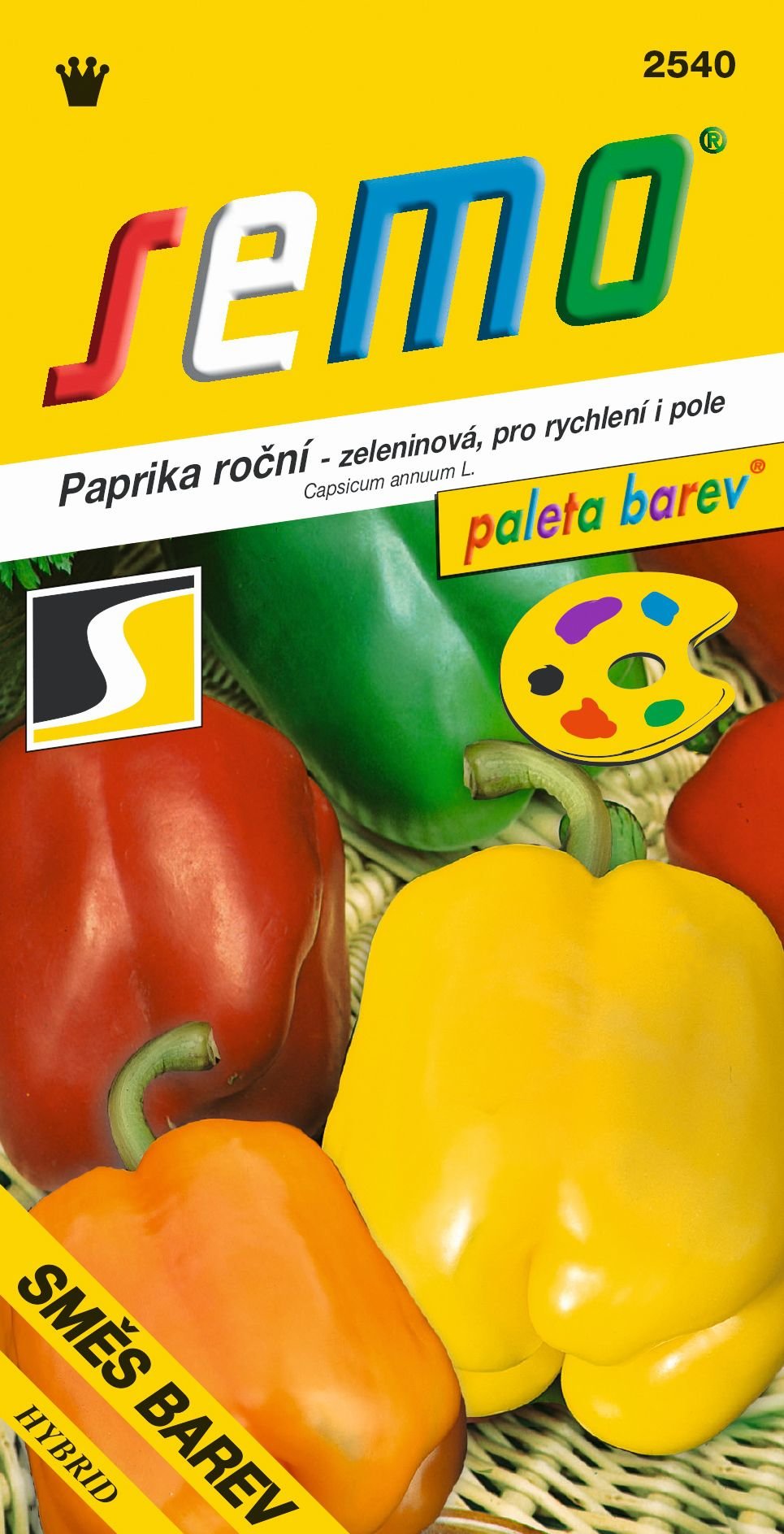 SMĚS BAREV - série PALETA - Směs silnostěnných kvadratických hybridů středního až vyššího vzrůstu určených pro pěstování ve sklenících a fóliovnících. Šťavnaté plody s vysokým obsahem vitamínu C jsou určeny hlavně pro přímý konzum. Při pečlivé agrotechnice a výživě vynikají vysokým výnosem. V teplejších oblastech jižní Moravy a jižního Slovenska je možno ji pěstovat i na poli. Osivo jednotlivých odrůd je v sáčku barevně odlišeno mořením - hybrid GELBY F1 žlutě, ORENY F1 oranžově a RUBIKA F1 červeně.